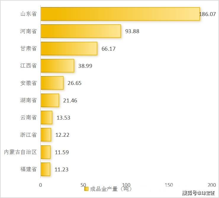 在2024年度中国黄金十大产金省排行榜中,山东凭借着186.07吨的成品金产量,排名第一。