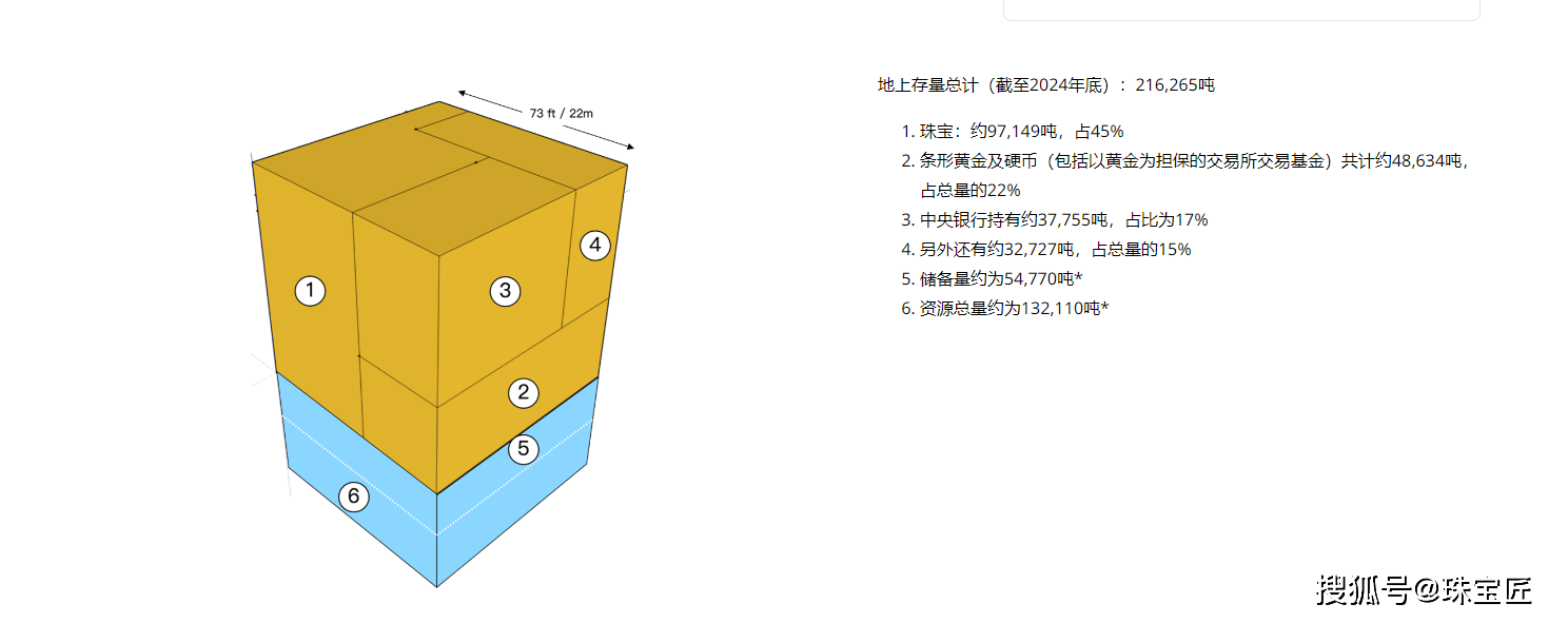 根据美国地质调查局(USGS)数据,截至到2024年底,全球地上黄金存量约为 21.6万吨,其中首饰约占45%,金条等投资形式约占22%,其余部分用于工业、央行储备等用途。