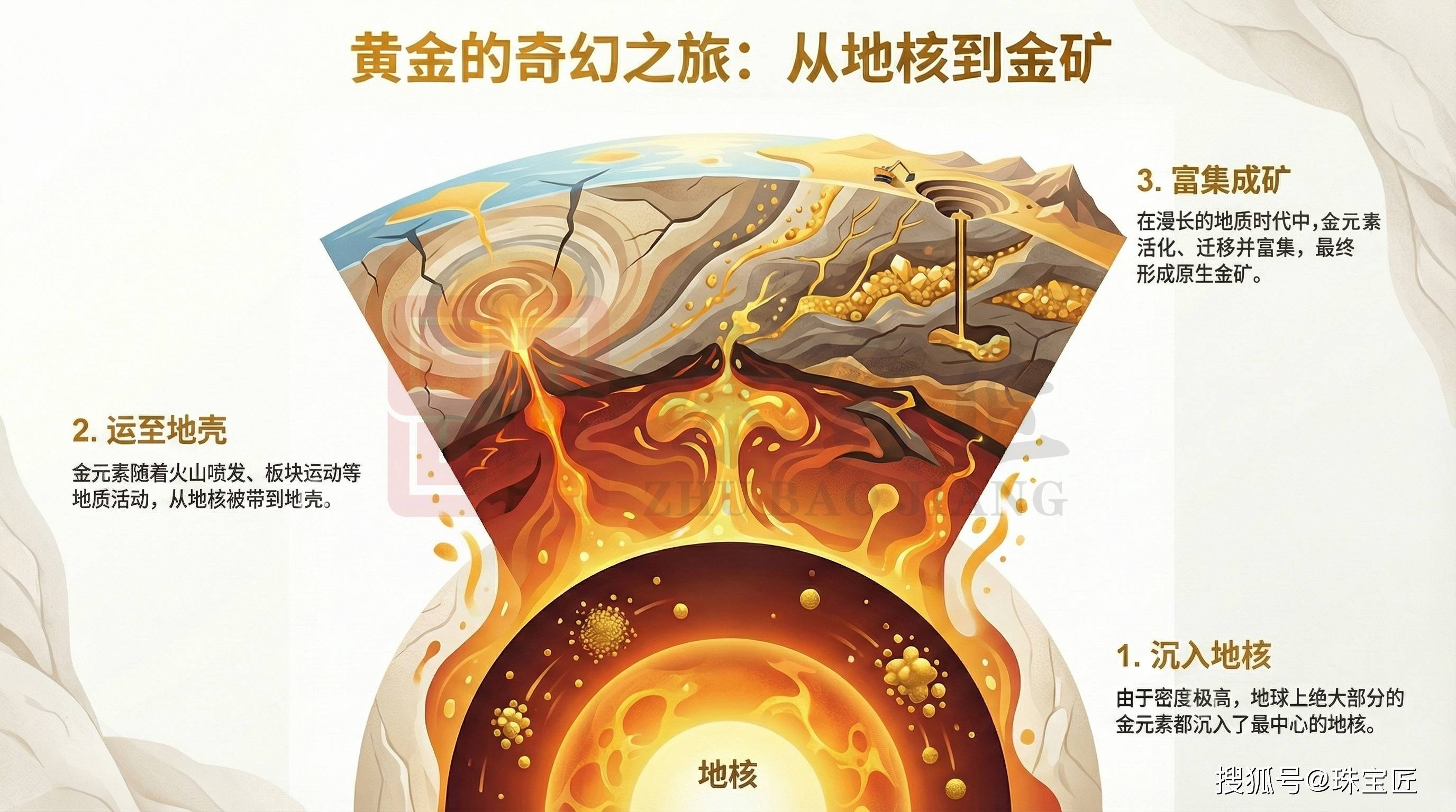 后来,深埋于地核的金元素随着火山喷发、板块运动等形式,从地核来到了地壳,在漫长的地质时代中活化、迁移、富集,经过亿万年积累,形成深埋于地下的原生金矿。