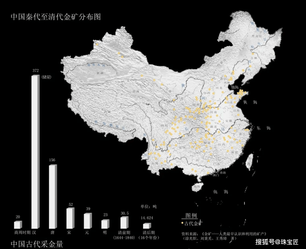 中国古代采金量(柱状图)及中国秦代至清代金矿分布图,图自《中华遗产》2010年8月