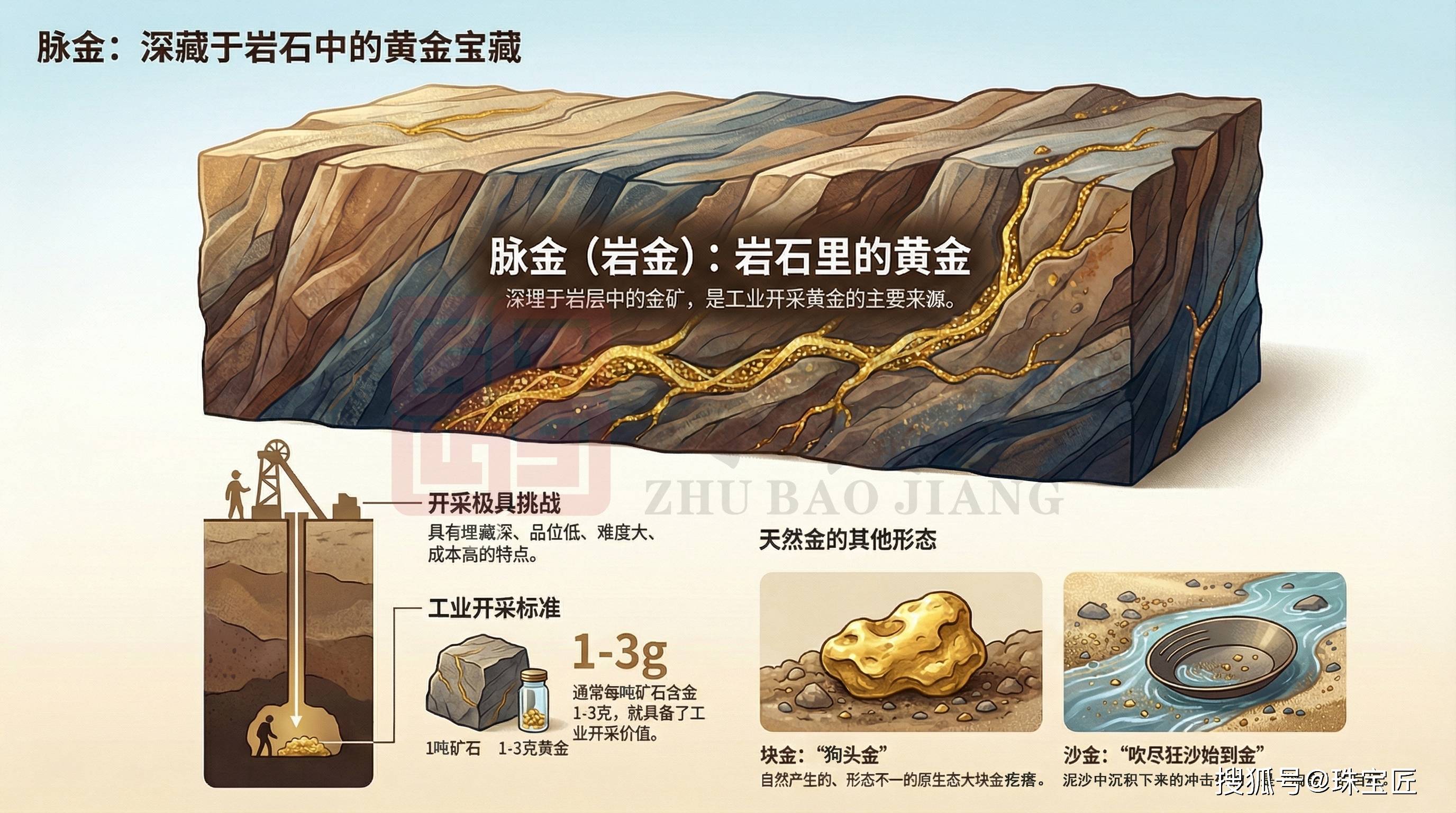 而我们今天所说的金矿,指的则是脉金,又称“岩金”或“原生金”,即岩石里的黄金,是含有金元素且具有工业开采价值的矿物集合体或矿床,埋藏较深,品位低,开采难度大,成本高。