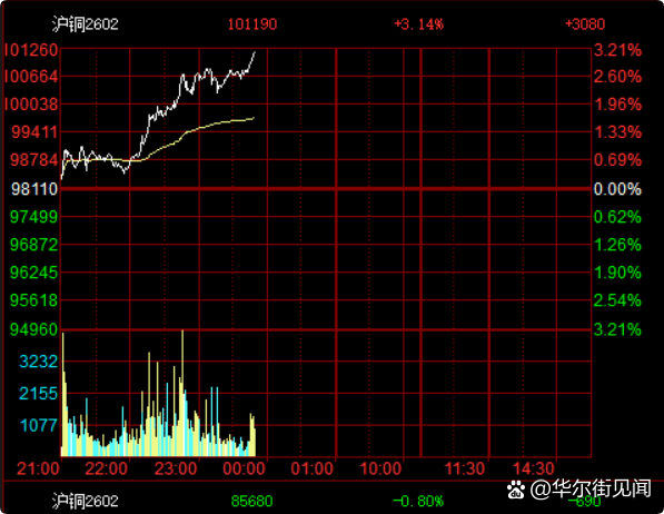 沪铜夜盘涨幅扩大至超过3.1%...