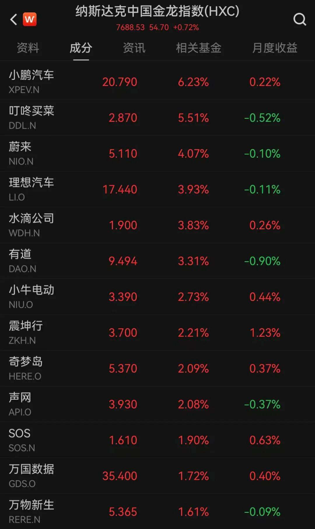 中概股多数上涨。Wind数据显示,纳斯达克中国金龙指数上涨0.72%。其中,小鹏汽车涨超6%,叮咚买菜涨超5%。