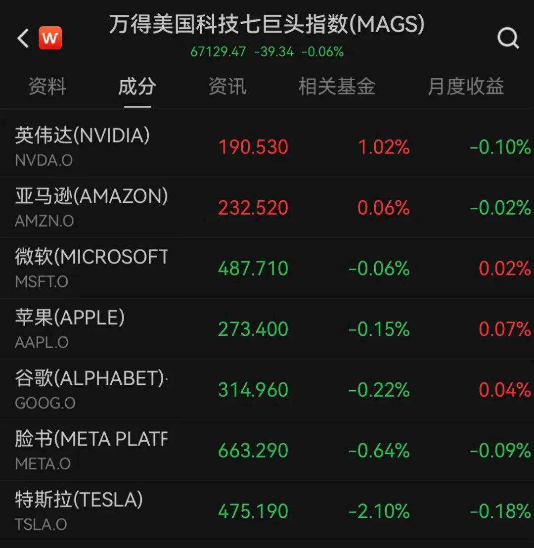 美股大型科技股多数下跌。Wind数据显示,截至收盘,万得美国科技七巨头指数下跌0.06%。其中,英伟达涨超1%,特斯拉跌超2%。