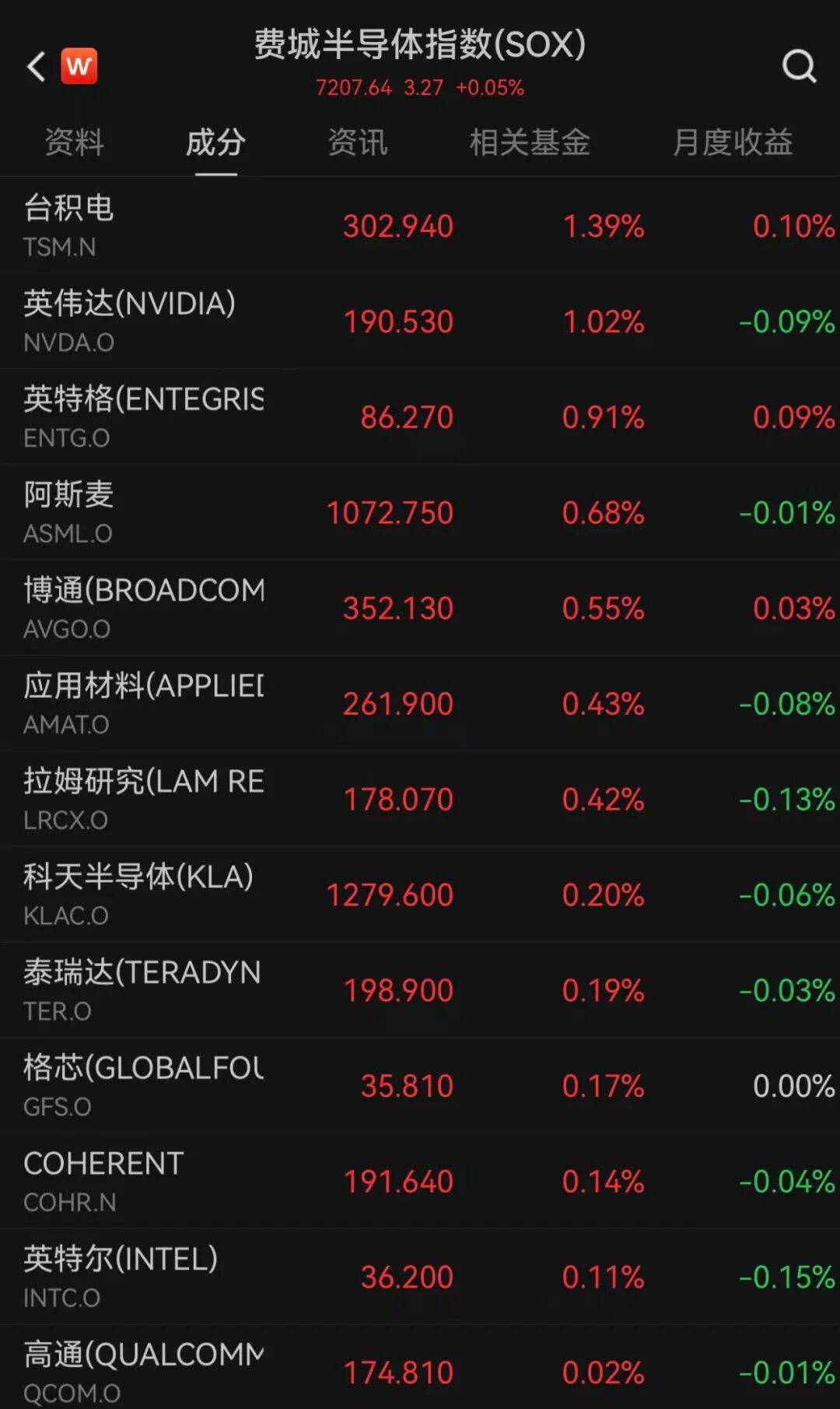 费城半导体指数涨0.05%。台积电涨1.39%,英特格涨0.91%。