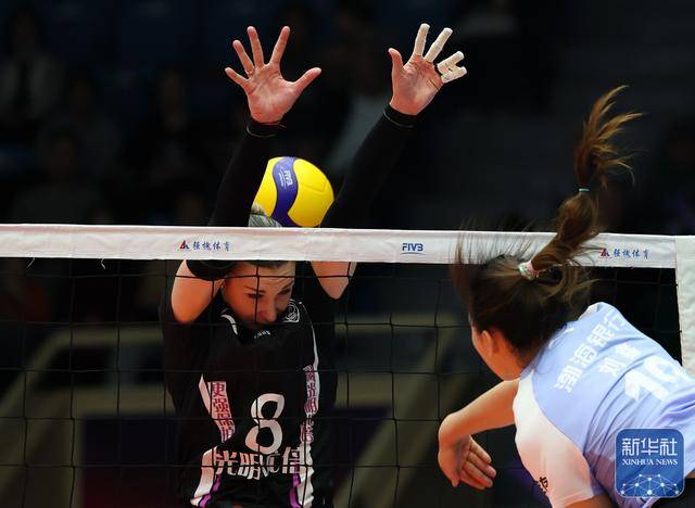 ↑ 上海光明优倍队球员沃隆科娃(左)在比赛中拦防天津渤海银行队球员刘鑫(右)的扣球。