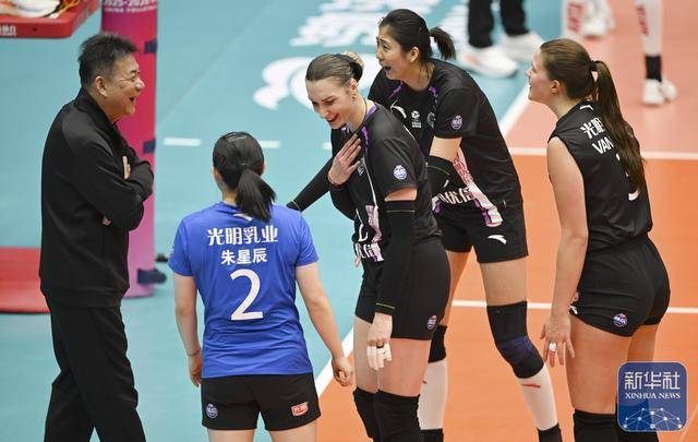 ↑ 上海光明优倍队主教练蔡斌(左一)与队员在比赛间隙交流。