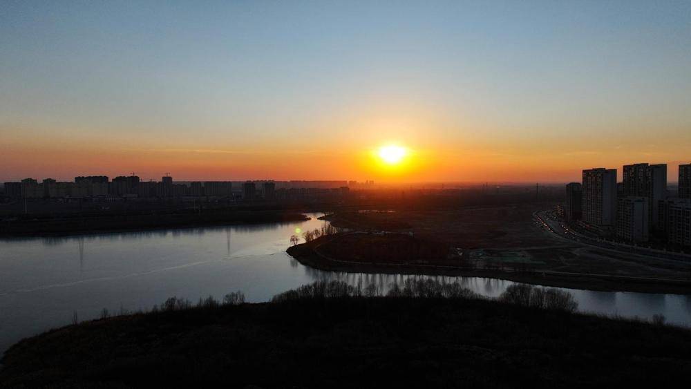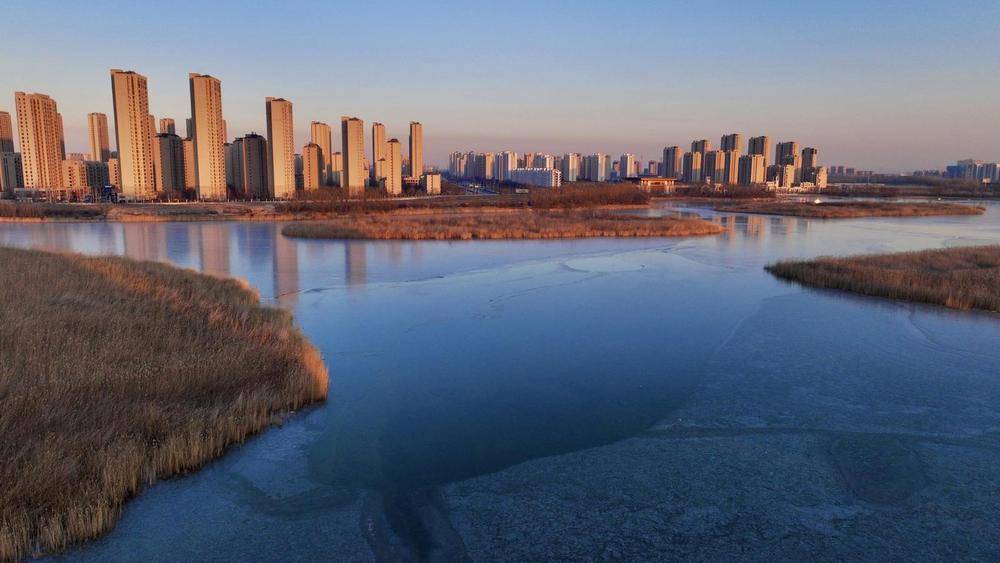 夕阳时分,从高处俯瞰,七子连湖展现出与平日截然不同的景象。冬季的低温让部分湖水结冰,冰面在夕阳余晖下反射出晶莹的光泽。远处高楼林立,近处枯黄的芦苇随风摇曳,城市的轮廓倒映在冰面上,仿佛一座微缩的冬日都市图景。