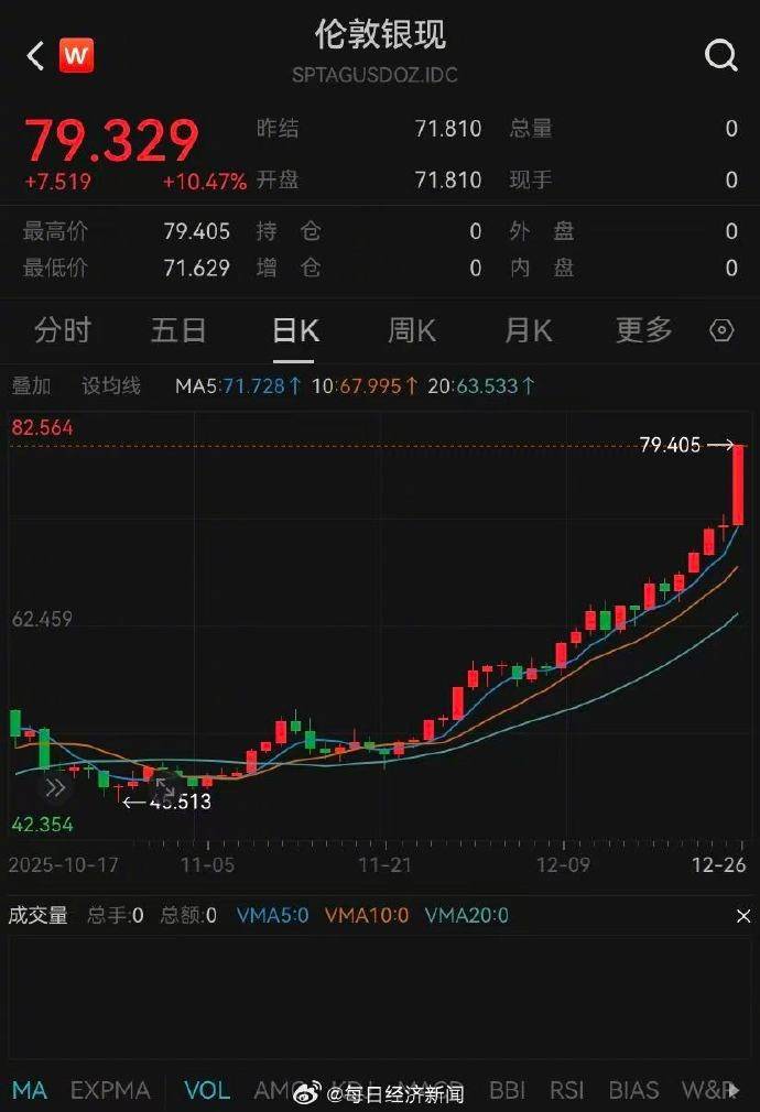 12月26日,现货白银涨10.07%,报79.1075美元/盎司,续创历史新高,本周累涨17.92%,年初至今累涨174.45%。白银的迅猛涨势远超黄金。
