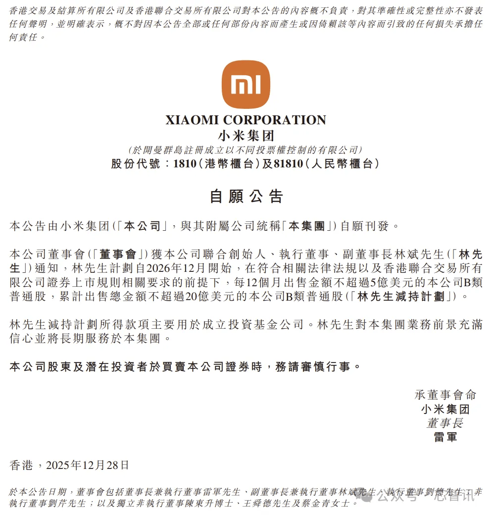 12月28日晚间,小米集团在港交所发布公告称,公司收到联合创始人、执行董事、副董事长林斌的通知:林斌计划自2026年12月开始,在合法合规的前提下,每12个月出售金额不超过5亿美元的公司B股普通股,累计出售总金额不超过20亿美元。