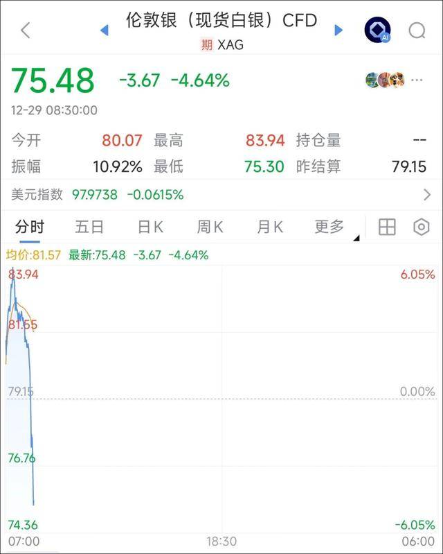 12月29日,现货白银大跳水,现跌近5%,此前一度涨近6%;现货黄金失守4500美元关口,现跌近1%。