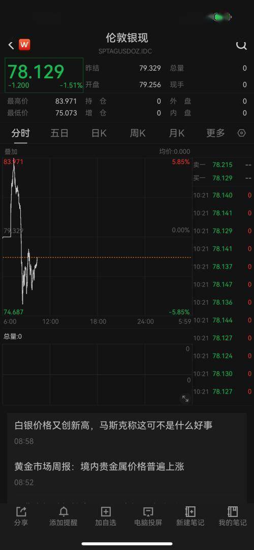 12月29日早间,现货白银(伦敦银现)大涨5.85%,突破83美元,随后直线下挫,盘中跌近5%。截至10时20分,跌超1.5%,报78.129美元/盎司。