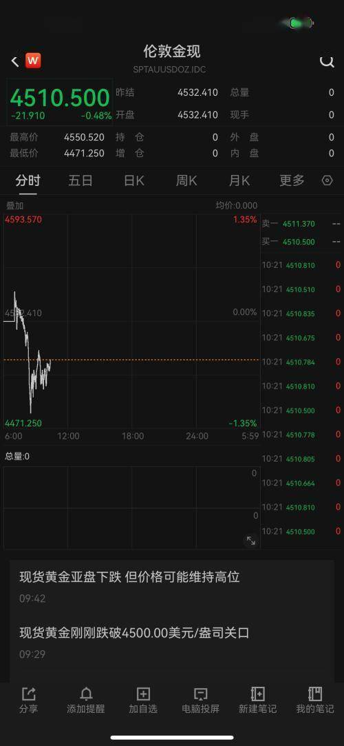 与此同时,现货黄金早盘也有所下跌,盘中一度跌破4480美元,随后上涨。截至10时20分,报4510.500美元/盎司,跌0.48%。