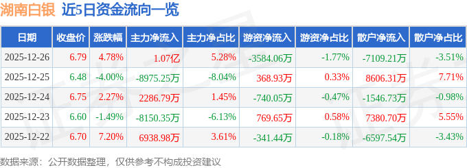 证券之星消息,截至2025年12月26日收盘,湖南白银(002716)报收于6.79元,上涨4.78%,换手率12.79%,成交量297.31万手,成交额20.25亿元。