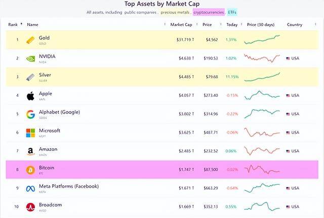 随着白银价格不断攀升,目前该贵金属市值已超越苹果,晋升为全球第三大资产,仅低于黄金和英伟达。