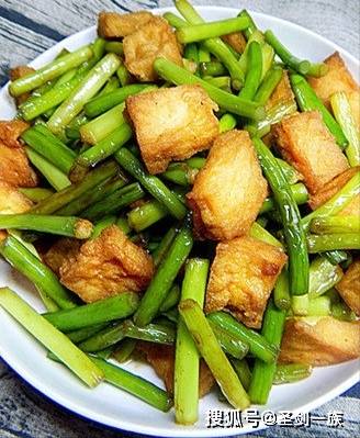 蒜苔200克、油豆腐150克、大蒜3瓣、生抽15毫升、盐3克、鸡精2克、食用油适量。