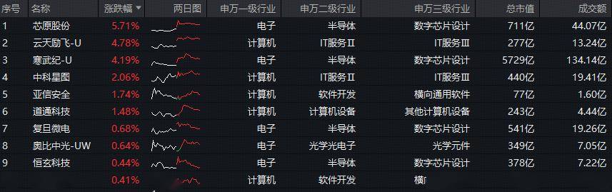 成份股方面,芯原股份领涨超5%,云天励飞、寒武纪涨逾4%,中科星图涨超2%,亚信安全、道通科技、复旦微电、奥比中光、恒玄科技、福昕软件等个股跟涨。