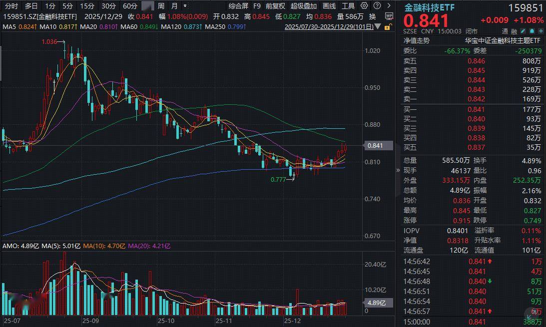热门ETF方面,同类流动性最佳的金融科技ETF(159851)午后直线冲高,场内逆市收涨1.08%,成交近5亿元。从技术面看,金融科技ETF(159851)斩获右侧四连阳,显示当前或进入多头主导的上行通道。
