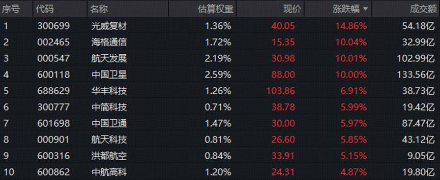 盘面上,商业航天题材强者恒强,人气居高不下。中国卫星、航天电子、航天发展等3股连续多日挺进A股成交额前十榜单,相关热门ETF——通用航空ETF华宝(159231)收涨1.72%触及历史高点,军工ETF华宝(512810)上探1.69%再创逾3年新高。