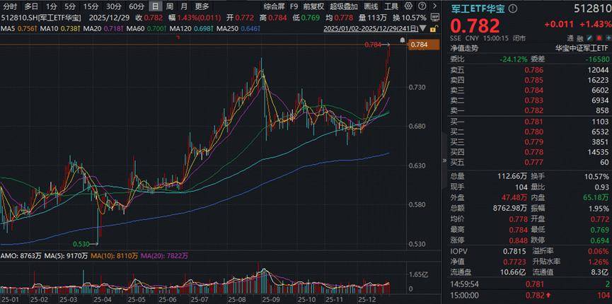军工板块高人气核心标的——军工ETF华宝(512810)盘中上探1.69%,场内价格继续刷新逾3年新纪录!收涨1.43%,日线成功斩获四连阳,全天成交8763万元。