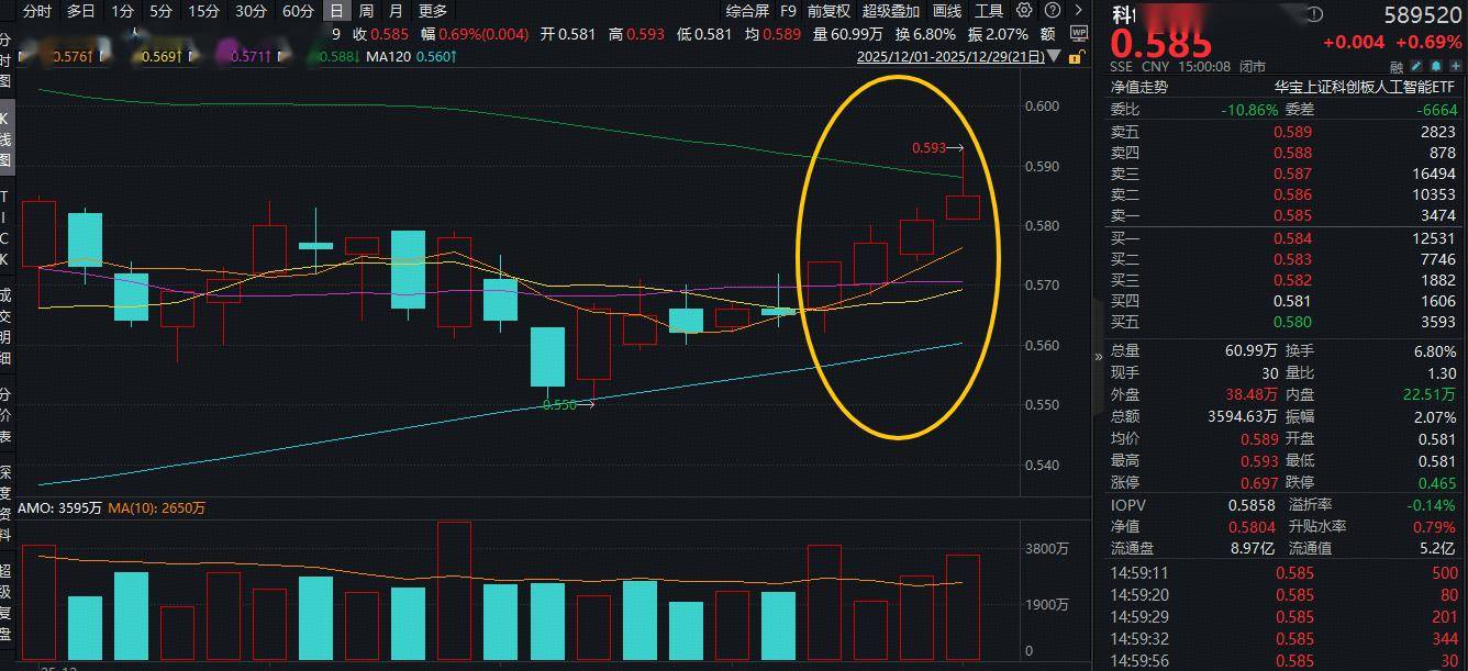 或由于芯原股份新签订单创历史单季度新高,算力芯片概念走强,重点布局国产AI产业链的科创人工智能ETF华宝(589520)场内涨幅最高上探2.07%,最终收涨0.69%,全天成交额3594万元,环比放量26%,成功斩获日线4连阳!