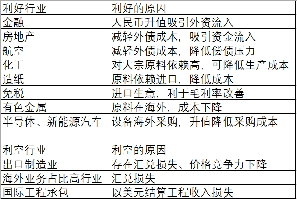 在人民币升值预期持续升温的背后,对包括金融、航空、化工、造纸、有色金属、免税等行业带来积极有利的影响。其中,金融行业受益于人民币升值带来的外资流入预期。航空行业受益于外债成本减轻,相应的偿债压力下降。化工、造纸、有色金属等行业,则受益于进口原料成本下降,成本减轻带来利润的增厚等。