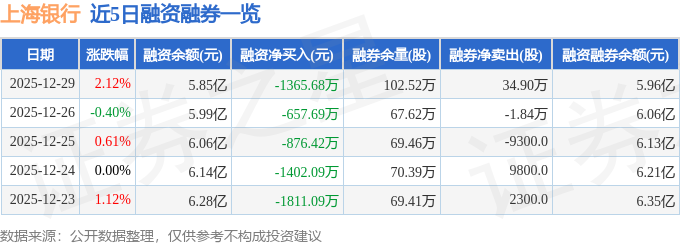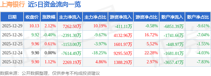 证券之星消息,截至2025年12月29日收盘,上海银行(601229)报收于10.13元,上涨2.12%,换手率0.5%,成交量70.78万手,成交额7.13亿元。