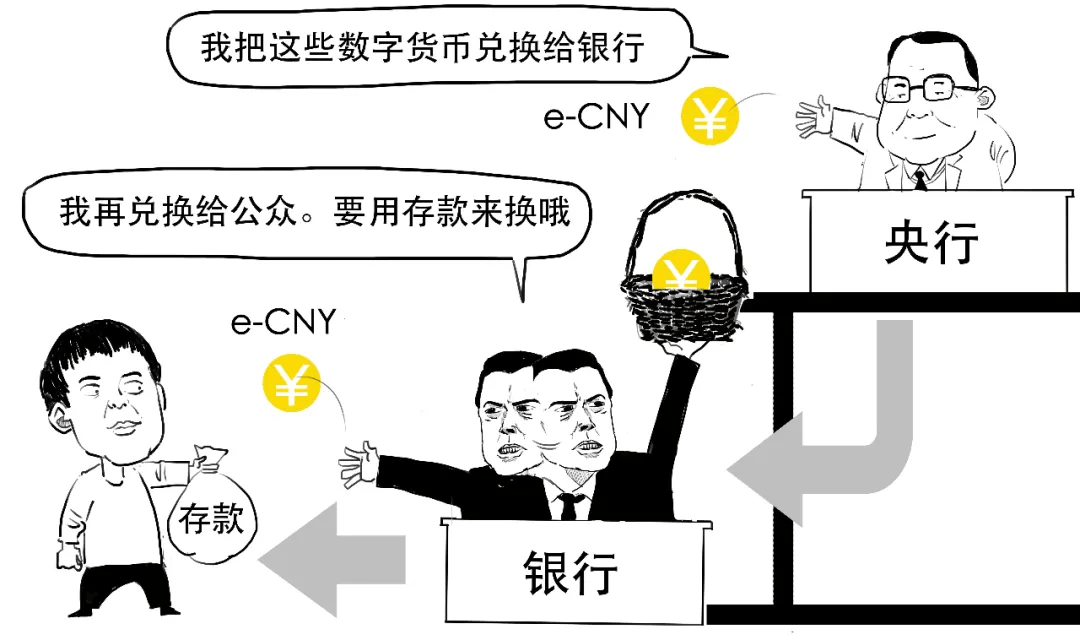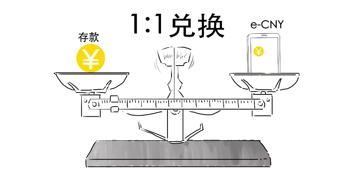 这里,数字人民币和普通人民币是1:1兑换的,商业银行或者公众要想获得数字人民币,必须拿已有的货币来换,