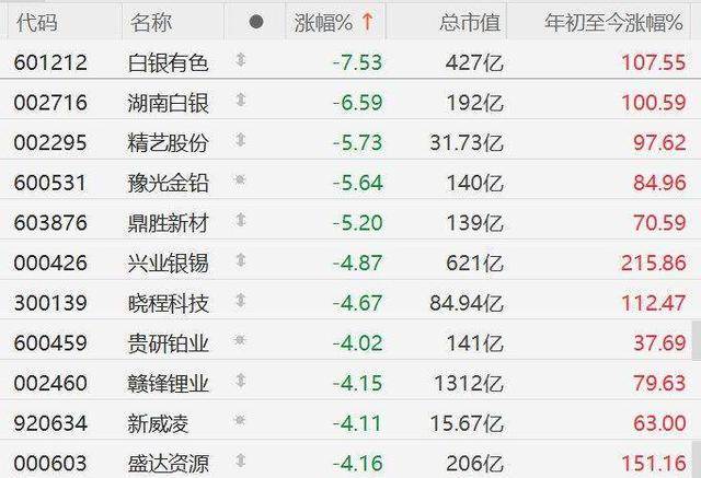 格隆汇12月30日|随着贵金属现货价格大幅跳水,A股市场有色金属股集体下挫。其中,白银有色跌超7%,湖南白银跌超6%,精艺股份(002295)、豫光金铅、鼎胜新材(603876)跌超5%,兴业银锡、晓程科技(300139)、贵研铂业(600459)、赣锋锂业(002460)、新威凌、盛达资源跌超4%。