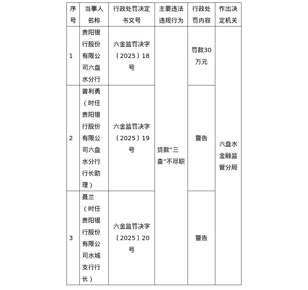 罚单显示,贵阳银行股份有限公司六盘水分行的主要违法违规事实(案由)为:贷款“三查”不尽职。