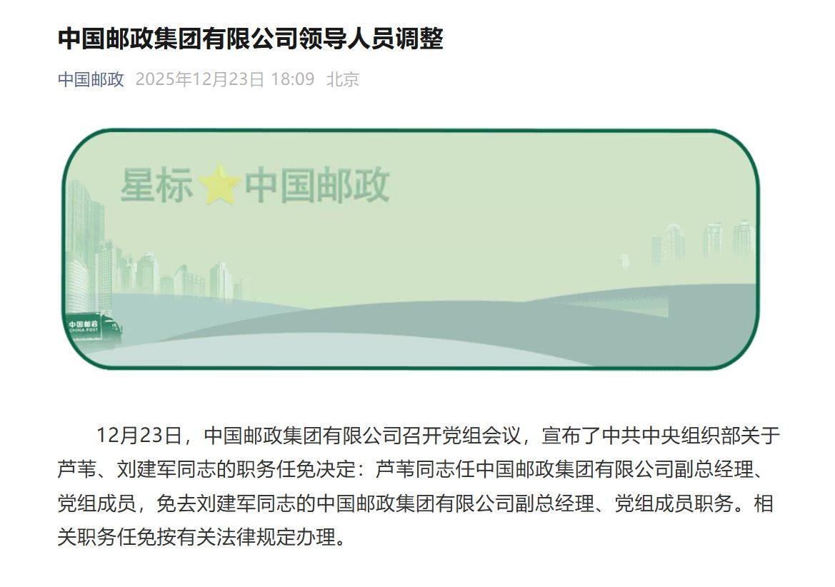 据“中国邮政”微信公众号,12月23日,中国邮政集团有限公司召开党组会议,宣布了中共中央组织部关于芦苇、刘建军同志的职务任免决定:芦苇同志任中国邮政集团有限公司副总经理、党组成员,免去刘建军同志的中国邮政集团有限公司副总经理、党组成员职务。相关职务任免按有关法律规定办理。
