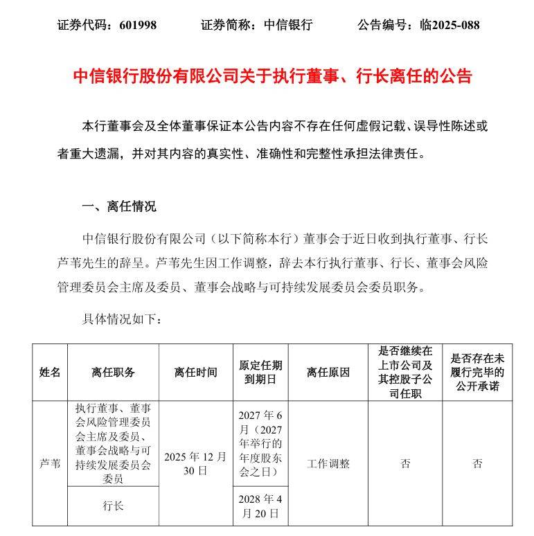 12月30日,中信银行(601998.SH,股价7.62元,市值4240.2亿元)公告称,董事会近日收到执行董事、行长芦苇的辞呈,芦苇因工作调整辞去相关职务,离任时间为2025年12月30日。