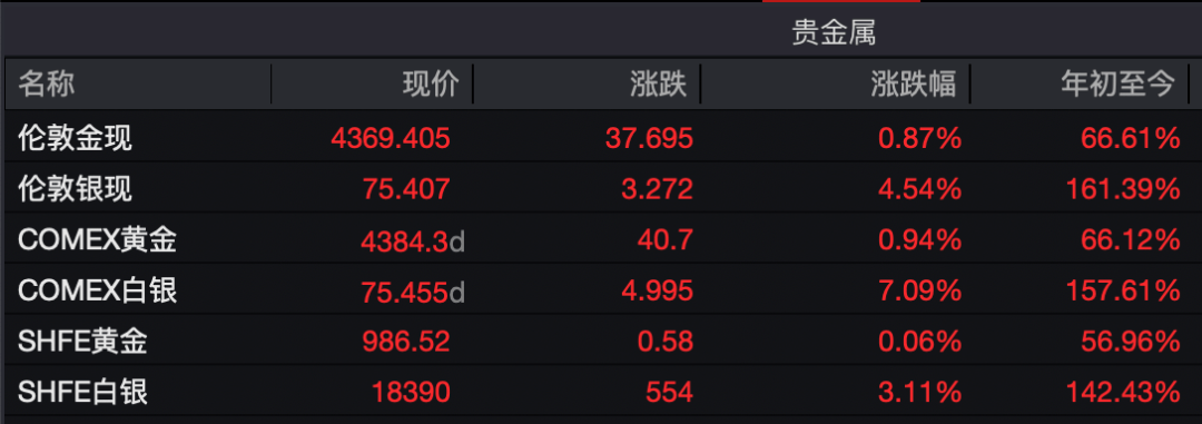 国际金银价格在大跌后企稳回升。截至发稿,伦敦金现报4369美元/盎司,日内涨0.87%。伦敦银现报75.4美元/盎司,日内涨逾4.5%,COMEX白银更是涨超7%。