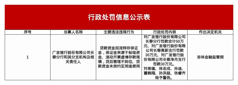 罚单显示,广发银行股份有限公司长春分行和其分支机构的主要违法违规事实(案由)为:贷款资金回流转存保证金,保证金来源于贴现资金、滚动开票虚增存款规模,贷后管理不到位、贷款资金未按约定用途使用。