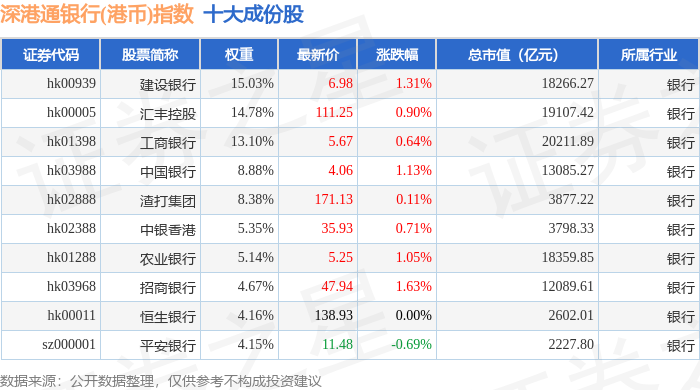 深港通银行(港币)(983082)指数十大成份股详情如下: