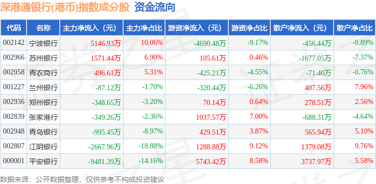 资金流向方面,深港通银行(港币)(983082)指数成份股当日主力资金净流出合计6714.86万元,游资资金净流入合计3239.0万元,散户资金净流入合计3475.86万元。成份股资金流向详情见下表: