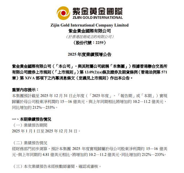 12月30日,紫金黄金国际(02259.HK)公告,预计2025年净利润约15-16亿美元,同比增加约212%-233%。