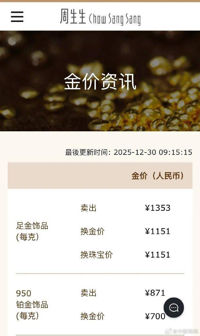 北京时间12月30日,国内品牌金饰价格随之下调,中新经纬查询到,周生生足金饰品报1353元/克,较前一日1406元/克跌53元。