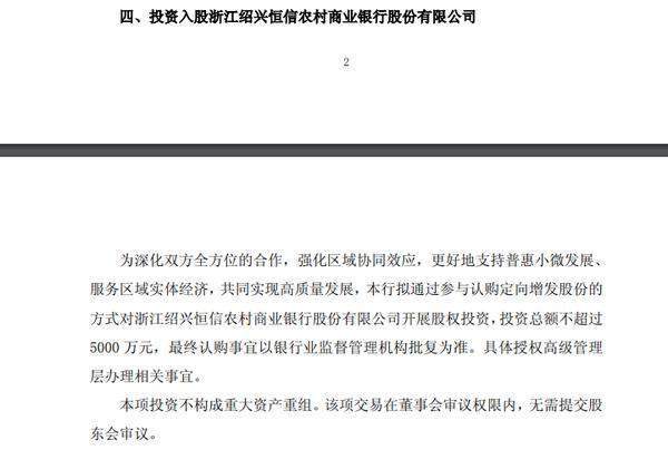 中国网财经12月31日讯 昨日,瑞丰农商行发布第五届董事会第六次会议决议公告。该行于2025年12月30日召开第五届董事会第六次会议。会议审议通过了《投资入股浙江绍兴恒信农村商业银行股份有限公司》的议案,该行拟通过参与认购定向增发股份的方式对浙江绍兴恒信农村商业银行开展股权投资,投资总额不超过5000万元,最终认购事宜以银行业监督管理机构批复为准。具体授权高级管理层办理相关事宜。