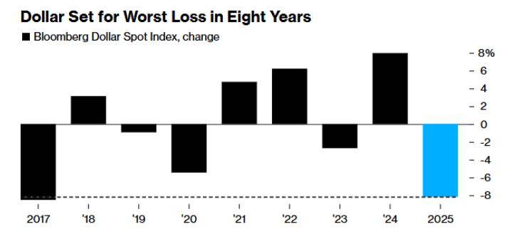 美元正面临八年来最大幅度的年度下跌,投资者表示,如果下一任美联储主席如预期般选择更大幅度的降息,美元还将进一步下跌。今年以来,美元现货指数已下跌约8%。继4月份特朗普宣布“解放日”关税政策后,美元大幅下挫,随后随着特朗普积极推动明年任命一位鸽派人士担任美联储主席,美元持续承压。