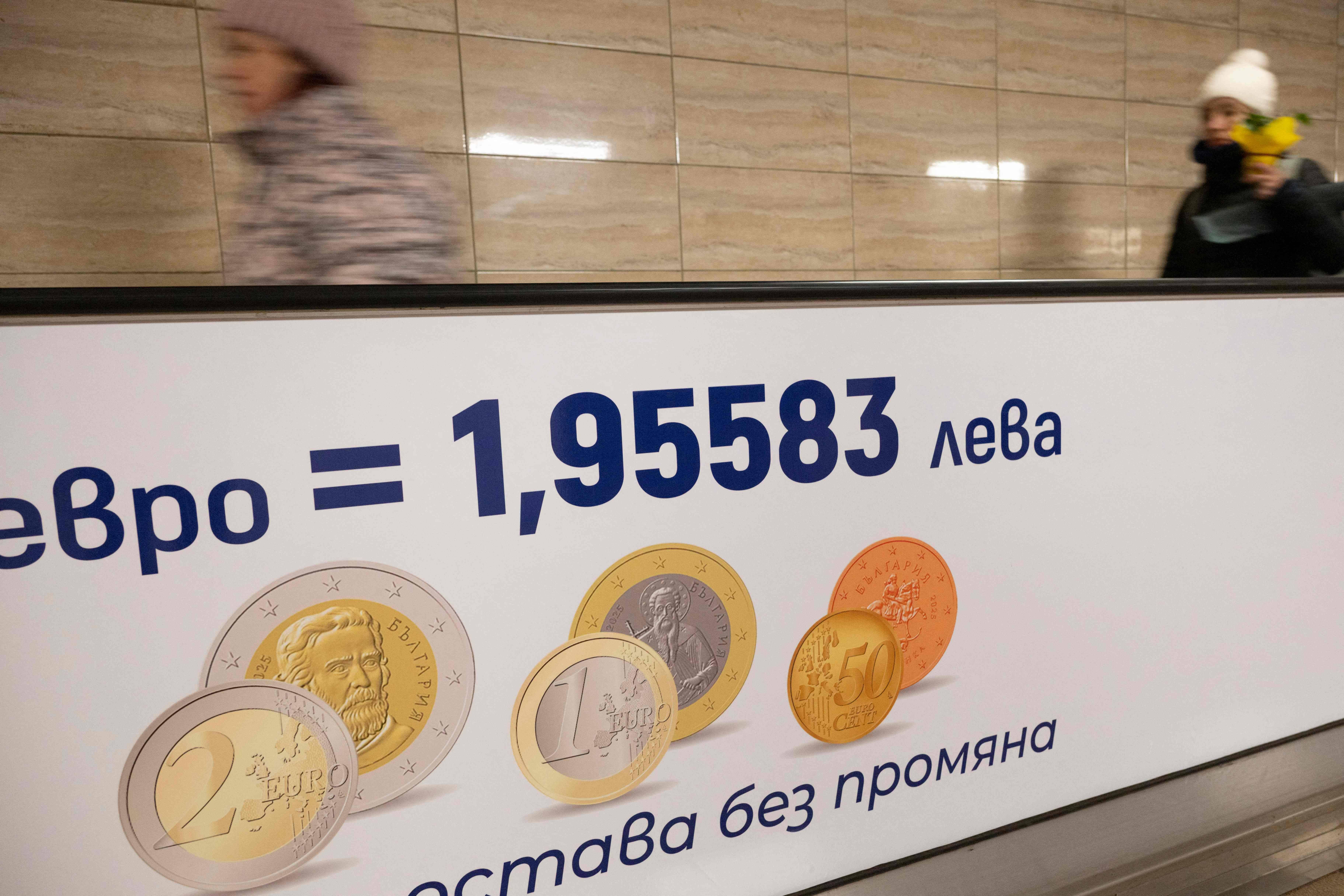 2025年12月31日,在保加利亚首都索非亚,人们走在印有欧元宣传内容的自动人行道上。 新华社/法新