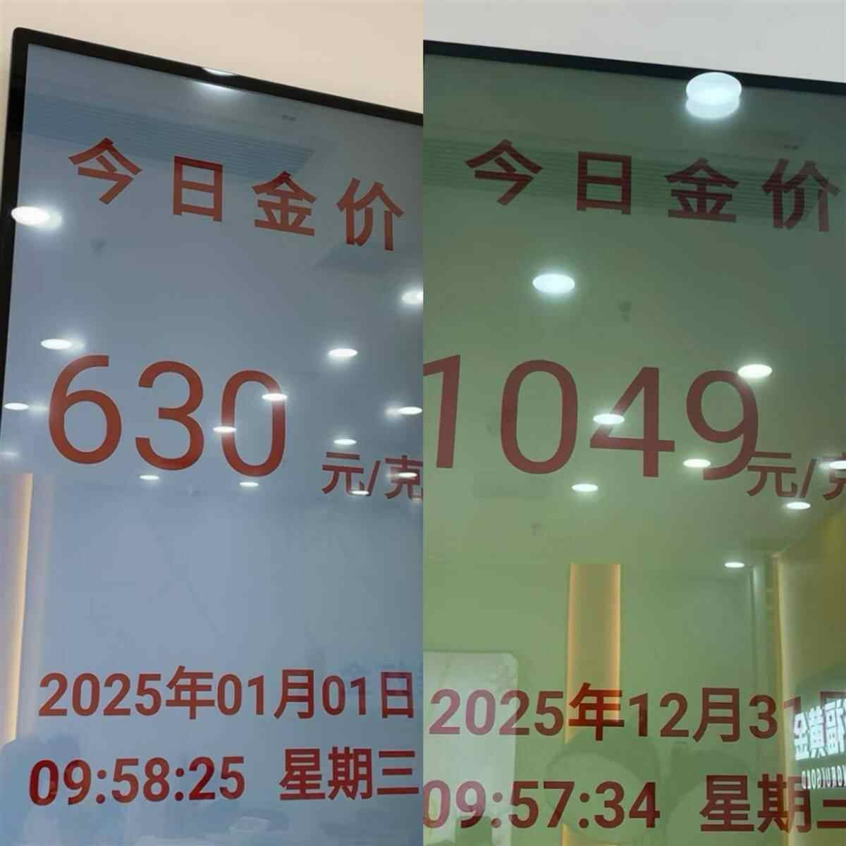 黄金饰品中的平价选手“水贝黄金”,也破千了。武汉六渡桥一家水贝黄金店,1月1日金价630元/克,年底为1049元/克。