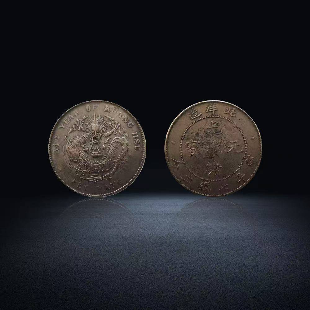 工艺细节的留存度,更是衡量这枚银币稀缺性的核心标尺。优质品相的34年北洋造银币,币面压力充足,“库平七钱二分”的字样无模糊缺损,背面龙纹的鳞甲、龙须清晰可辨,边齿规整如刻,敲击时音质清脆悠扬。而这类品相的银币,大多被国内外博物馆、顶级藏家收藏,民间流通的真品寥寥无几。此外,该银币还存在少量特殊版别,如英文“PEI YANG”漏印、龙纹变体等错版币,存世量不足二十枚,2024年某国际拍卖会上,一枚错版34年北洋造银币以超百万元成交,其稀缺价值可见一斑。