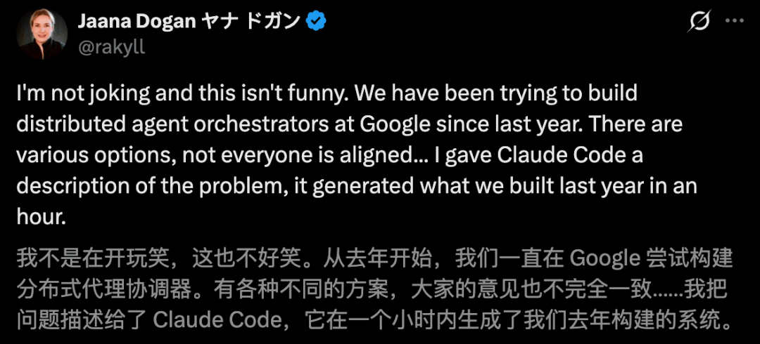 谷歌首席工程师Jaana Dogan连发多帖,高度赞扬Claude Opus 4.5——