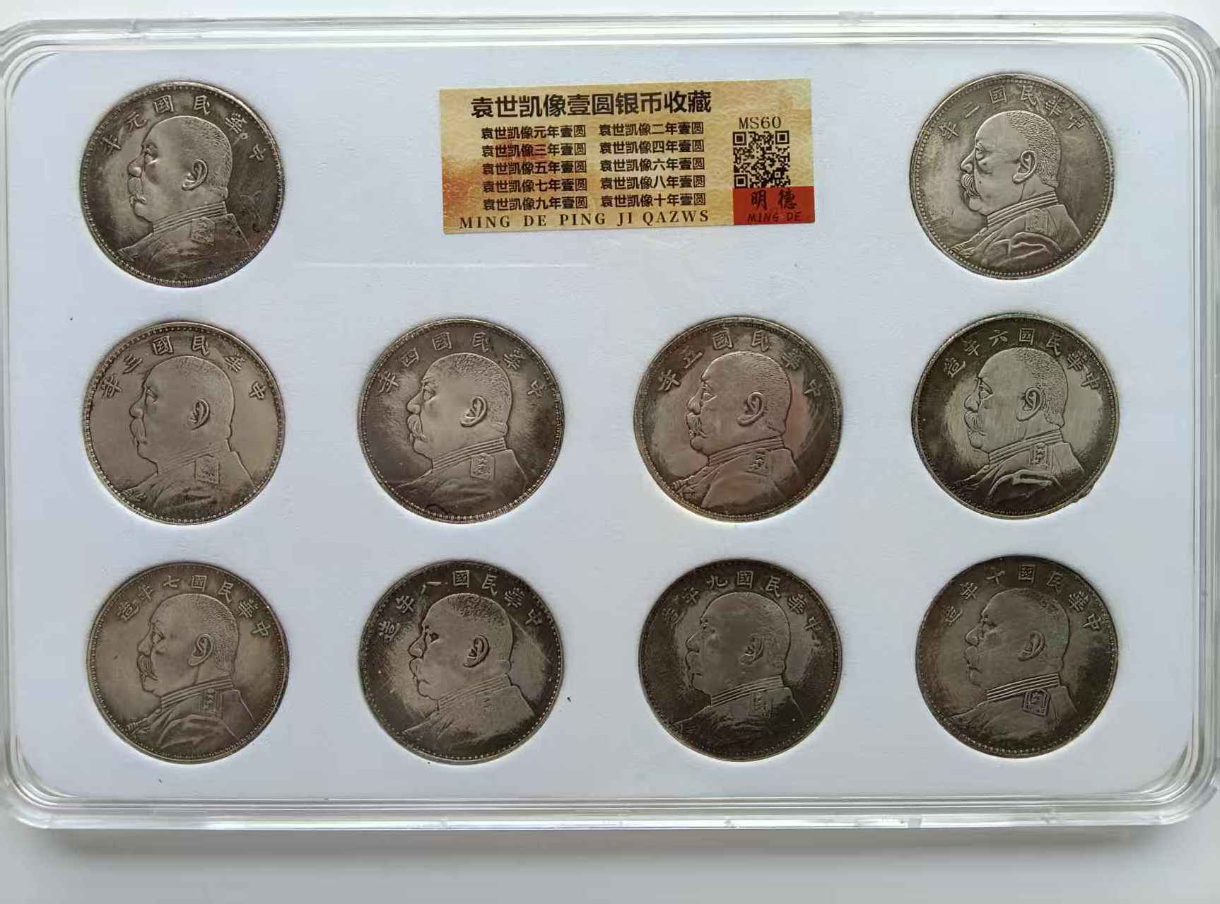 这套银币采用“明德评级”封装,每枚币配透明盒与信息标签,标注年份与评级(均为MS60)——这种形式让散存的袁大头变成了“标准化历史标本”: