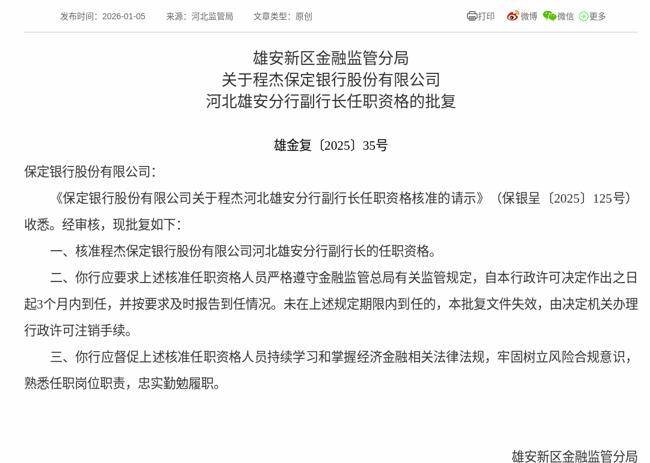 2026年1月5日,根据国家金融监督管理总局消息,《保定银行股份有限公司关于程杰河北雄安分行副行长任职资格核准的请示》获得通过,批复程杰保定银行股份有限公司河北雄安分行副行长的任职资格。