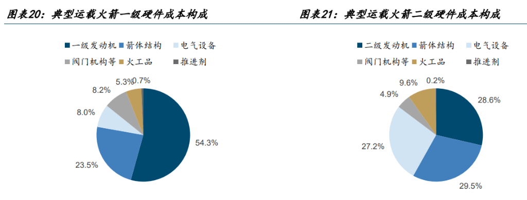 在产业链投资价值分布上,发动机和箭体结构是绝对的核心。在一枚典型的液体运载火箭中,发动机和箭体结构占据了硬件成本的绝大部分,其中一级火箭的发动机和结构占比高达77.8%。