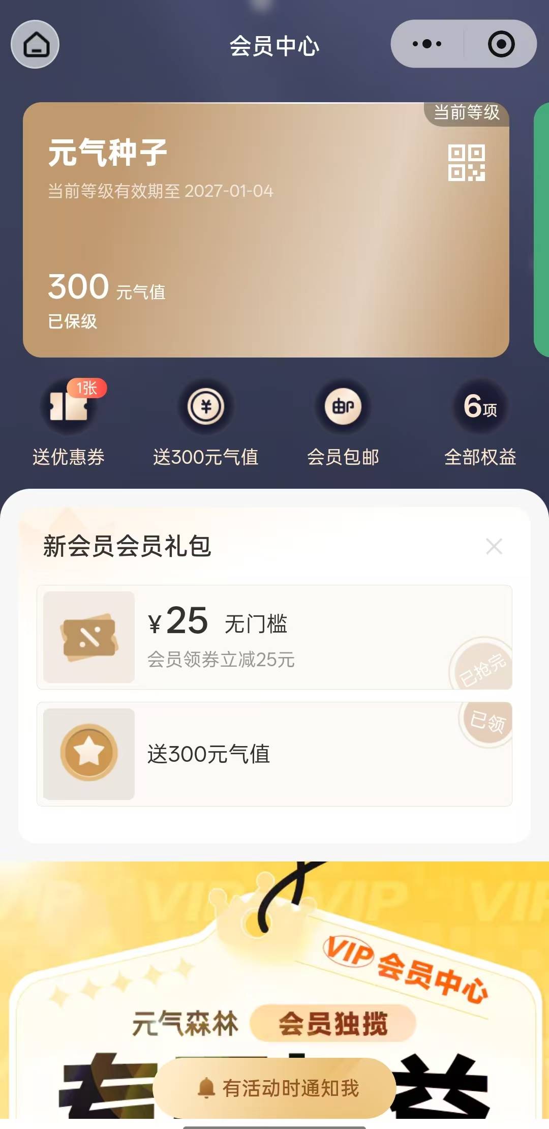 结合元气森林现有会员体系,扫码用户可积累积分(消费1:1兑换积分,会员享2倍积分),积分可用于兑换周边产品或抵扣消费;同时,小程序会推送25元会员优惠券等权益,引导用户二次购买。