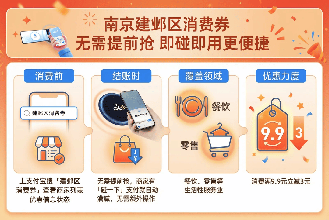 为营造喜庆祥和的新春消费氛围,大力提振消费,南京市建邺区从2025年12月31日起,面向在建邺区消费的市民发放3批政府消费券。市民无需提前抢券,在参与活动的商户通过支付宝“碰一下”支付,即可自动领券享受“消费满9.9元立减3元”的到店优惠。