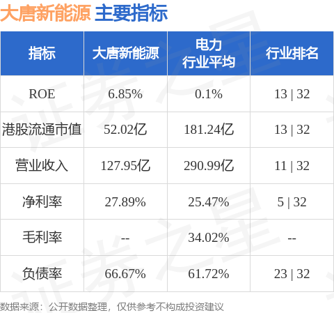 大唐新能源港股市值52.02亿港元,在电力行业中排名第13。主要指标见下表: